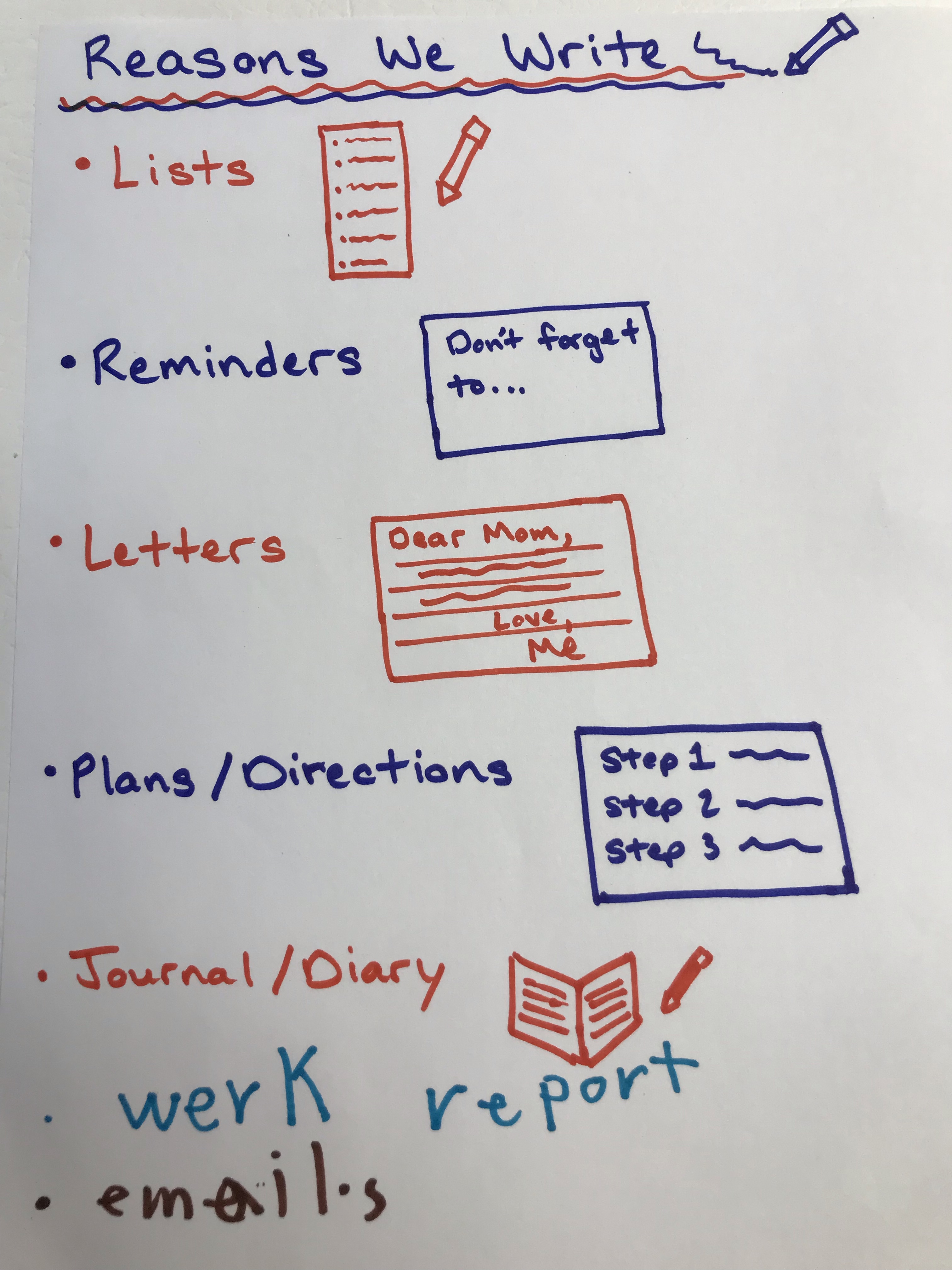 How It Works: I like to make a chart with my students about all of the real-world reasons that we write. I often have students survey family and neighbors outside of school to discover all of the reasons they write at home and in their jobs, and then add what they find to our chart.