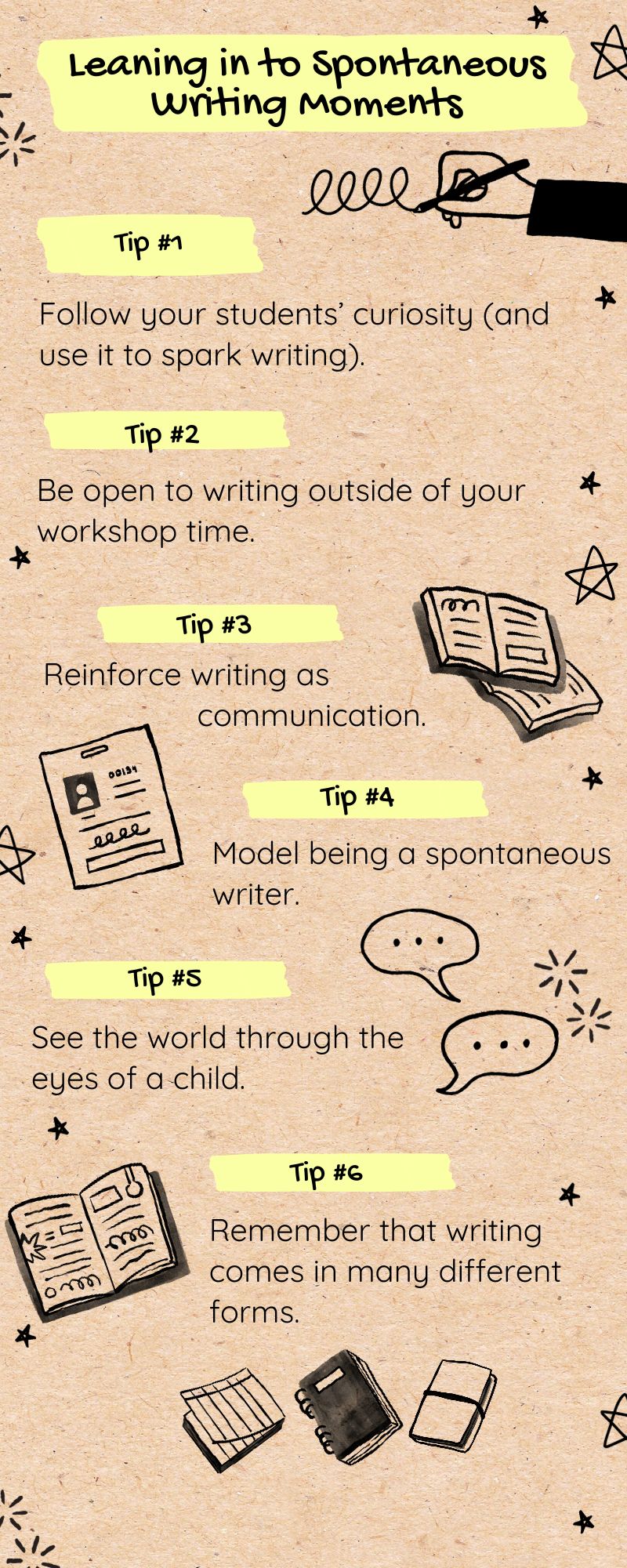 - Think like a child. What is going on in their world that is exciting and new? What is so important that it must be captured on paper? Things that seem insignificant to adults might just be the most important thing in the world to our students. Prompt kids to jot down what’s important to them. (A notebook is a great place to capture this writing!)