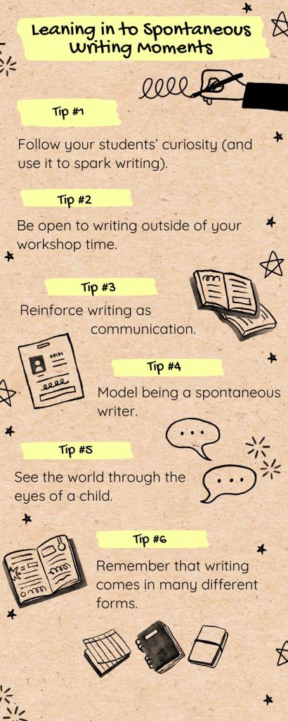 - Model your own spontaneous writing. You have no idea how far announcing, “Wait! I need to write that idea down” might go for a group of impressionable young writers.