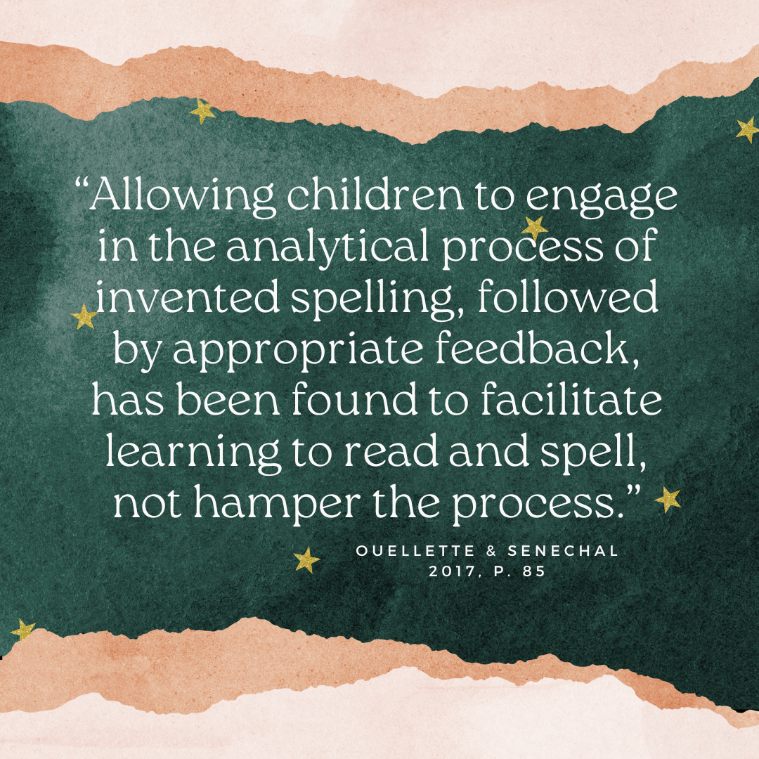 - Oullette and Senechal’s (2017) landmark study tracked students from Kindergarten to first grade, analyzing the sophistication of their invented spelling. They found that the Kindergarteners’ invented spelling positively influenced conventional spelling and reading ability once the kids reached first grade.