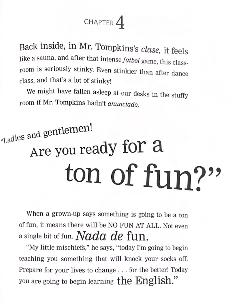 I have struggled to find newer texts where a characters’ identity is a subtle part of the story. Many newer titles have less of a narrative structure and instead celebrate uniqueness in very overt ways. However, I have been returning to Juana Medina’s series about Juana and Lucas. Juana is the main character who lives in Bogotá, Columbia. Readers quickly learn she is a strong character who loves the place she lives, the people around her, and her dog Lucas. Juana Medina uses many craft moves that students could replicate to highlight their own identities in their writing. For example, Medina utilizes a lot of translanguaging, which means fluently going between two different languages. The mix of languages in Juana and Lucas is a celebration of Juana’s identity.