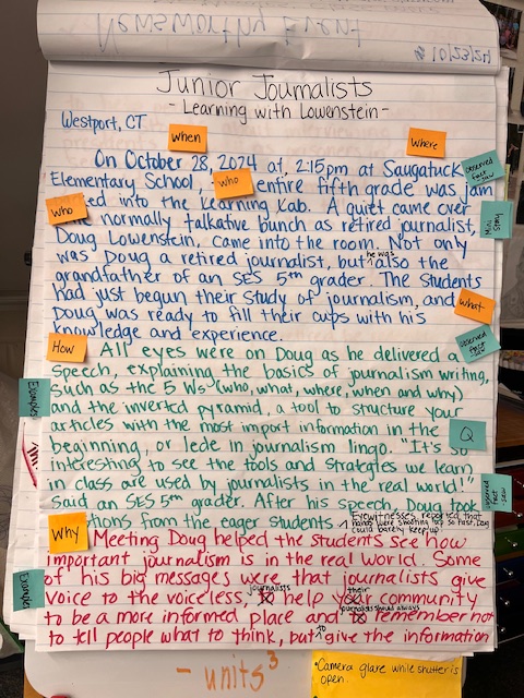 On October 28, 2024, at 2:15 pm at Saugatuck Elementary School, the entire fifth grade was jam packed in the learning lab. A quiet came over the normally talkative bunch as retired journalist Doug Lowenstein came into the room. Not only was Doug a retired journalist, but he was also the grandfather of an SES 5th grader. The students had just begun their study of journalism, and Doug was ready to fill their cups with his knowledge and experience.