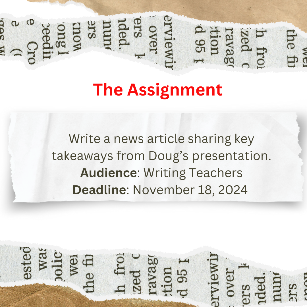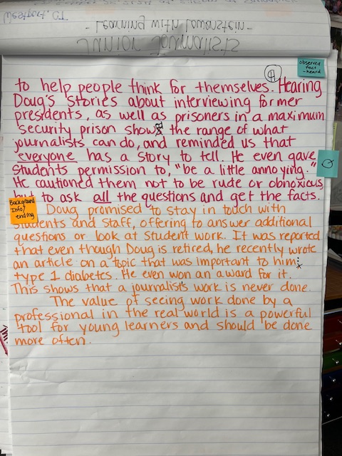 A big part of our planning process included considering our audience. Knowing that our article would be read by writing teachers raised the stakes and had the students critically thinking about what details would be relevant to writing teachers. They wanted to report on the facts, and also convey the message that hearing from a real-world journalist impacted their learning in a positive way.