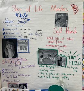 • Charts depicting the craft moves you’ve found in mentor texts should hang in the classroom. I encourage students to walk up to charts to peruse and choose. You can even print mini-charts for their writer’s notebooks or folders.