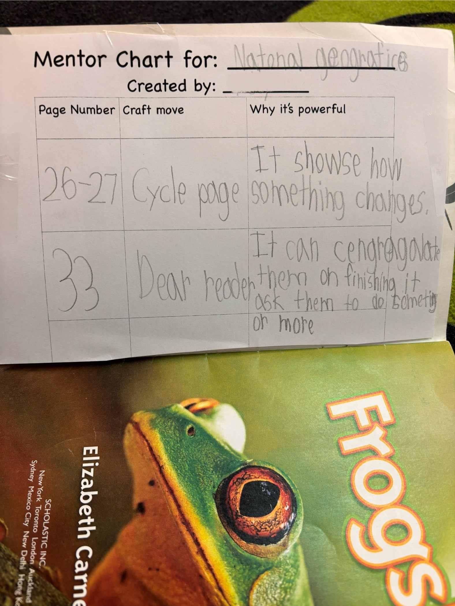 Students taped their charts to the inside cover of the mentor text. The annotated texts are now on the writing shelf for other students to view.
