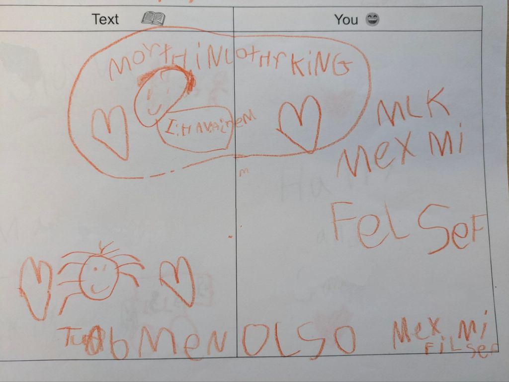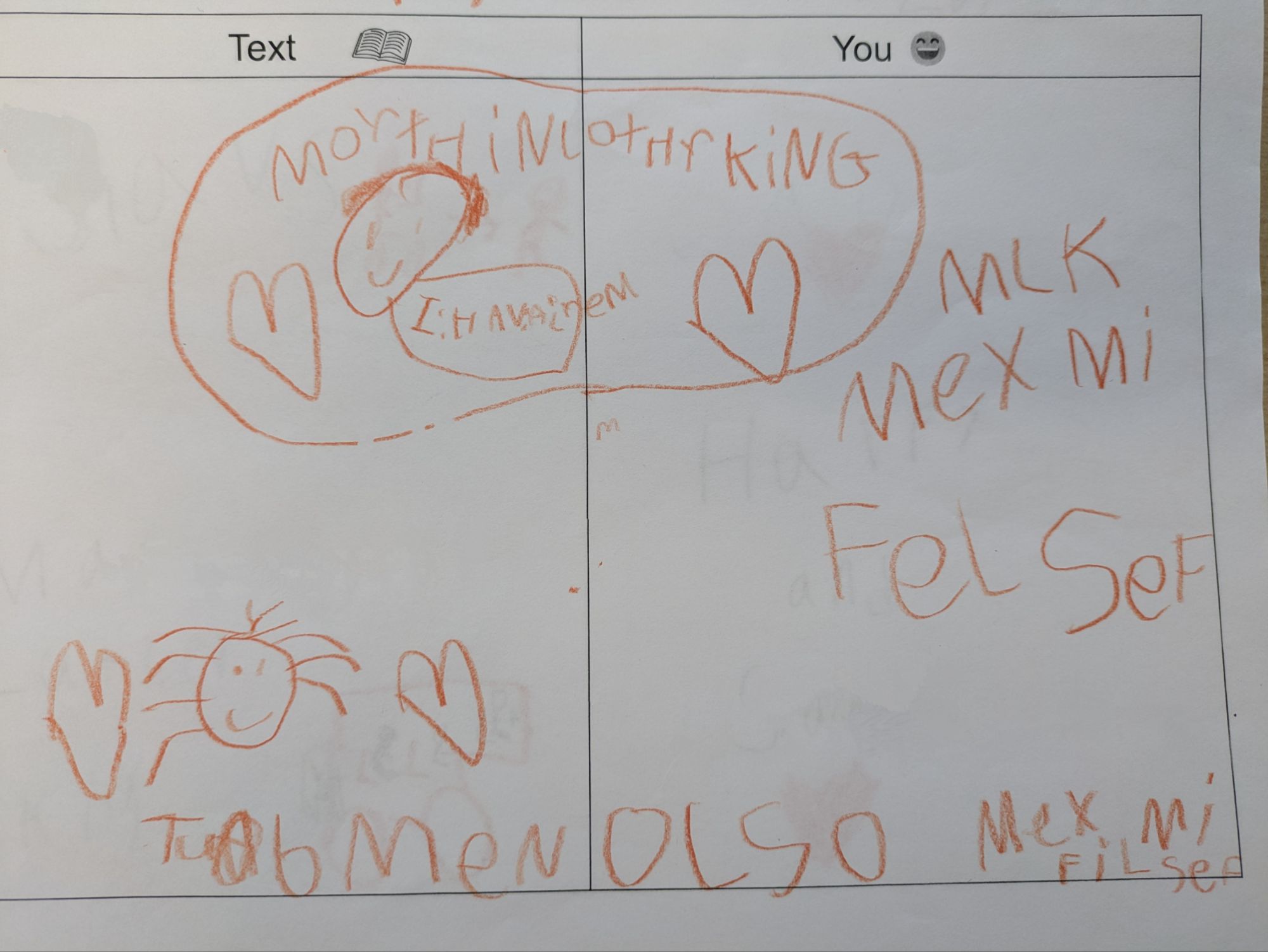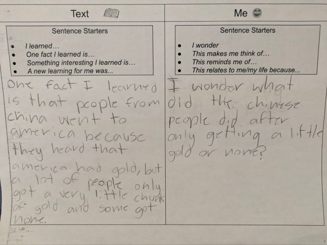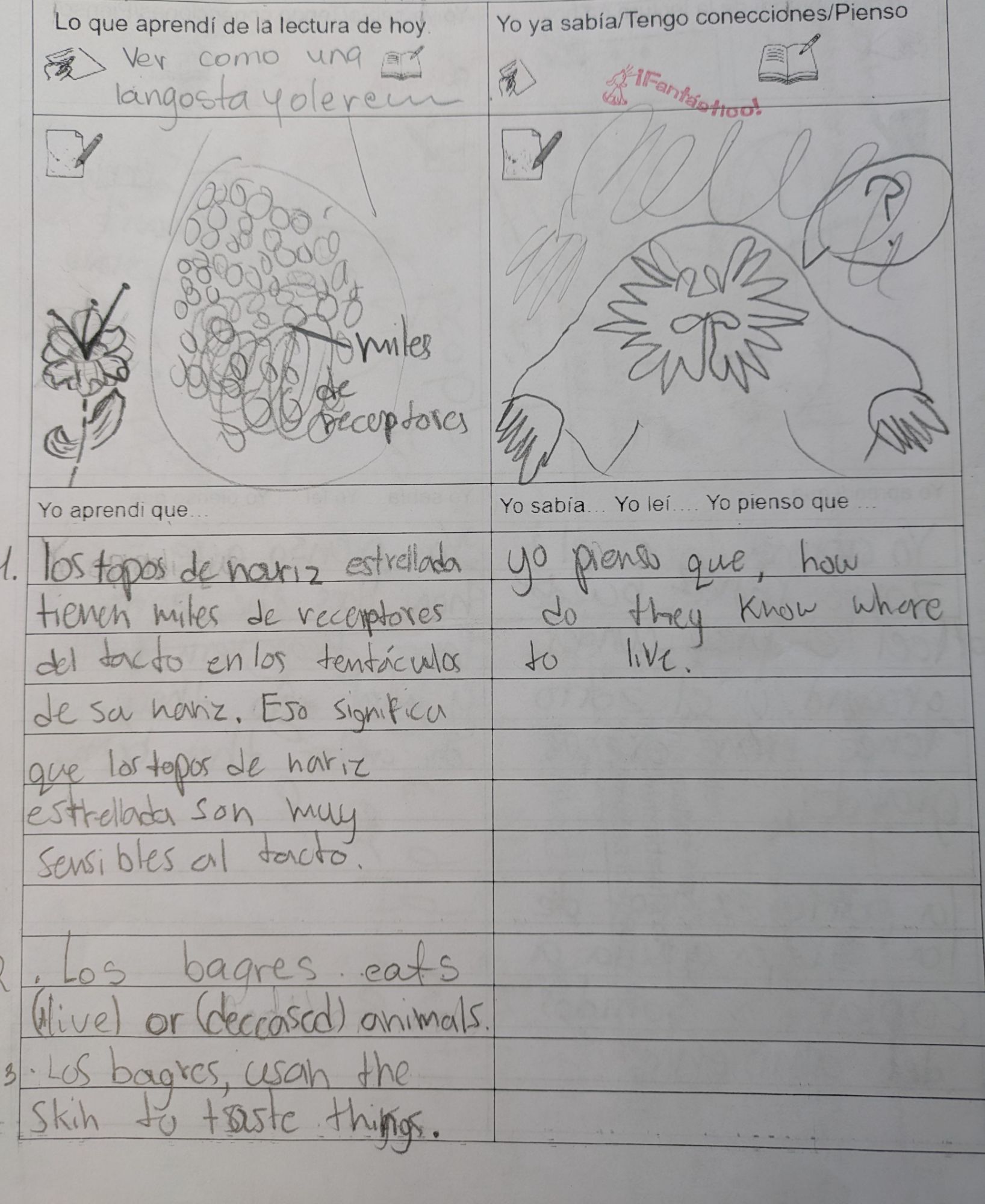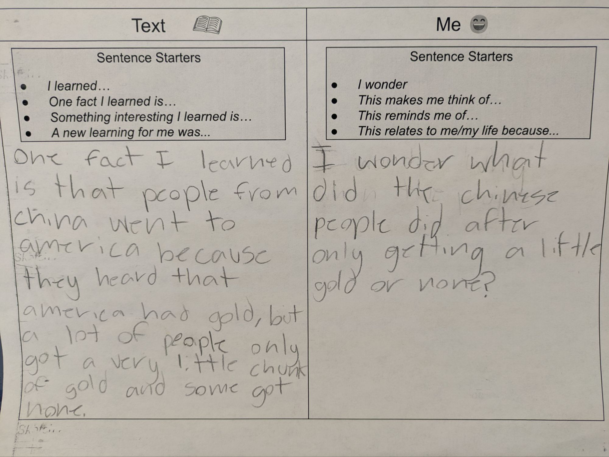 On the right side, students write and sketch their personal thoughts, reactions, and connections to their new learning. Students will often write questions they have, related information they know, or personal stories they are reminded of by the information. Through these questions, stories, and connections, teachers get to know more about their students’ experiences and interests.