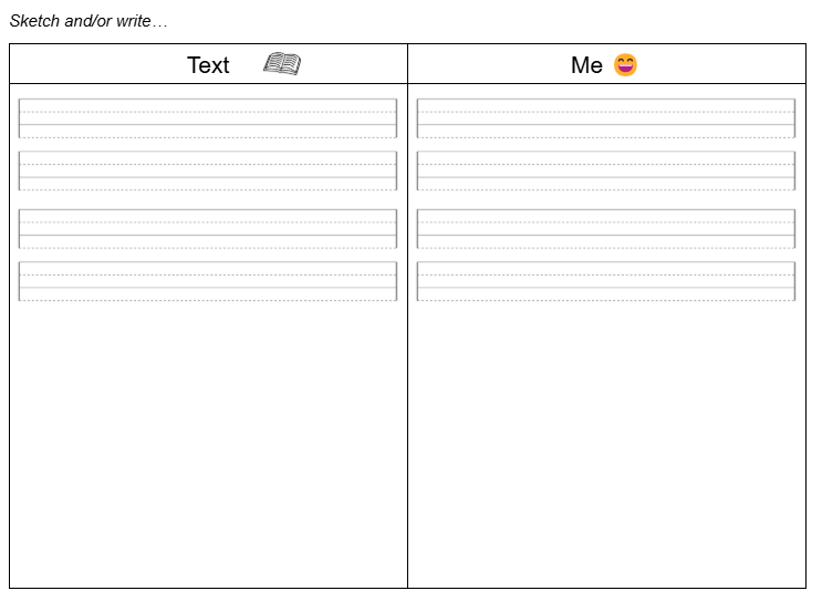 How It Works: Learning Logs are simply a sheet of paper divided in half with the word “Text” on the left and “You” or “Me” on the right.