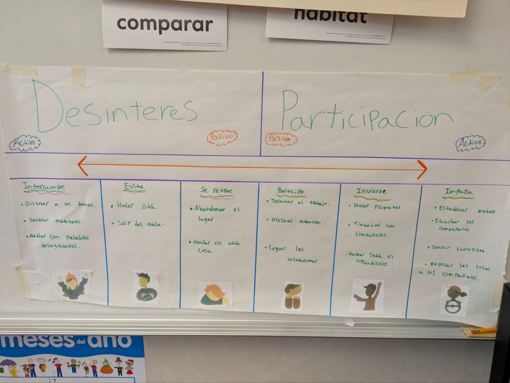 Teachers are finding the engagement continuum especially helpful in promoting student success during independent and partner work times. Before sending students off to write, for example, teachers might have students set a goal for themselves and then check in on how it went at the end of the period. Some teachers have printed and laminated mini-copies of the continuum that students put in front of them during partner time to keep themselves engaged in their learning. Interestingly, we have observed that most partnership frustrations occur when partners are at different places on the continuum. When students are disengaged, we can use the continuum to help students identify what they need to do to shift back to the engaged side of the continuum. When we see students participating, investing, and driving their learning, we can use the continuum to call it out to the student and the whole group.