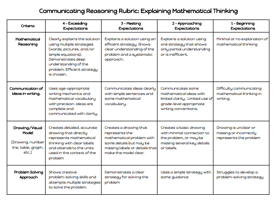 A few months ago, our school’s math coach, Lisa Wolff, led a faculty meeting on the topic of communicating reasoning in math. She defined this as students’ ability to clearly and precisely construct viable arguments to support their own thinking and to critique the reasoning of others. Lisa also shared a rubric she had developed, highlighting key components of this skill: mathematical reasoning, communication of ideas, and the use of drawings or visual representations. At its core, this work is about how effectively students can use the language and symbols of math to bring these elements together in response to a problem.