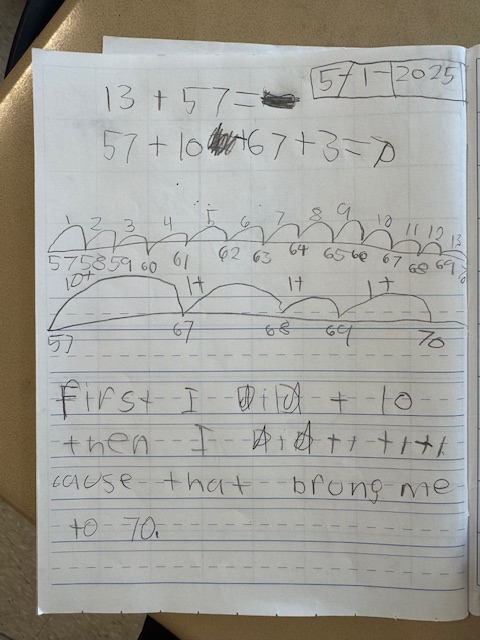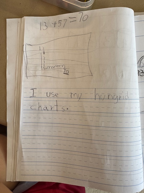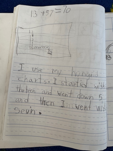 In this sample, you can see how this student had a very simple explanation of their thinking using words. However, when asked, she showed me how she used her hundreds chart to find the sum. I encouraged her to add onto her thinking, which you can see in the second photo.