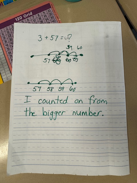 After a quick class discussion, students agreed that counting on from the larger number using a number line was the most efficient strategy. Jess invited a student to demonstrate the strategy under the document camera—similar to how we invite students to “share the pen” during interactive writing.