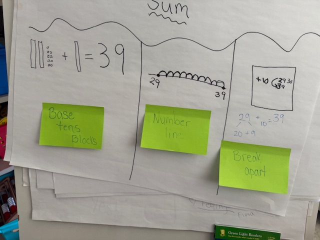 She referred to the anchor chart of strategies the class learned to solve addition problems. Students had a moment to generate possible strategies, just like they would brainstorm ideas during shared writing.