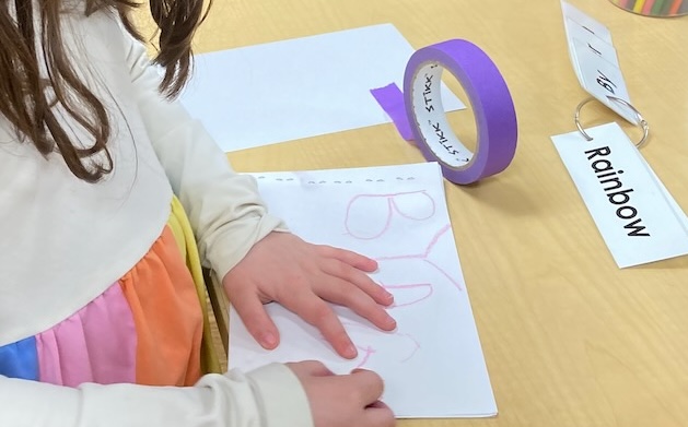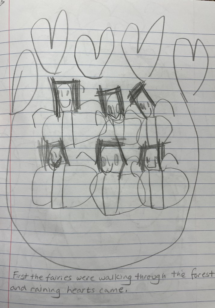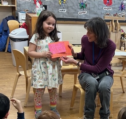 Journals: In Cathy’s class, writing happens organically. During the first week of school, she gives each child a black and white speckled composition book, which serves as their journal. She makes it a very exciting occasion by explaining that their journal is a special place where they can draw and write about anything they want. The children write in their journals every day after they clean up their snack, and twice a week, Cathy and her co-teacher(s) take dictation. Cathy truly lets the children take the lead and honors whatever language the child uses to describe their drawing — from a one-word label to a complex story. She engages each child in a conversation about their work, prompting them to say more when possible, and infusing rich vocabulary along the way, (i.e., “I notice you made a looping line today!”) As the year progresses, some children begin to write stories that can be acted out by the class in the manner of Vivian Gussin Paley’s “storyacting” methodology. Journals provide her four and five-year-old students with a predictable and consistent writing routine that is both personal and social.