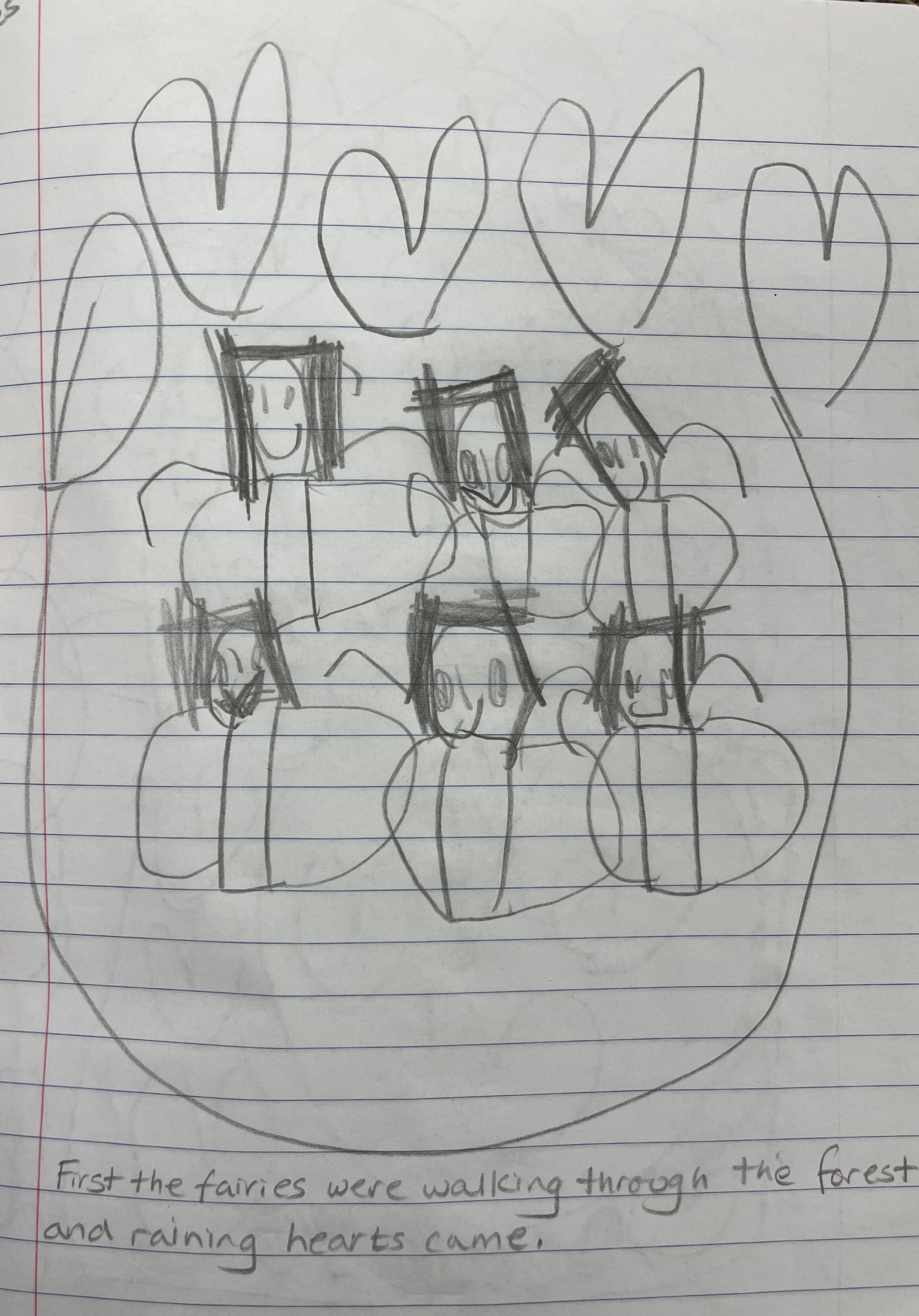 Book Making: Around Thanksgiving time, Cathy works with each child to create a page for a class “Thankful Book.” The pages feature a drawing of what each child is thankful for, along with the dictated description. Cathy makes sure to introduce the concept that they are authors and illustrators who can create books, just like the authors and illustrators who make the books she reads to them during storytime. From there, she typically finds that children begin to naturally make their own books during work time. She organizes the art center with paper and drawing materials, and teaches them how to use a stapler safely. After drawing on several sheets of paper, the children learn to staple the pages together and dictate their story to her. She also explains that their books need to have a title and “by” their name on the front cover, as well as the words “The End” somewhere in the back. Once a book is finished, the children have the opportunity to read their book aloud to the class (usually with Cathy’s help). This, of course, is where so much of the magic of being an emergent writer happens.