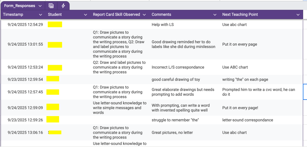 Each Google Form response automatically includes a date stamp, which helps me ensure I meet with every student regularly. (Tracking dates also keeps me from over-conferencing with my neediest students, which supports their independence.) Here’s what my spreadsheet looks like, with student names covered for privacy.