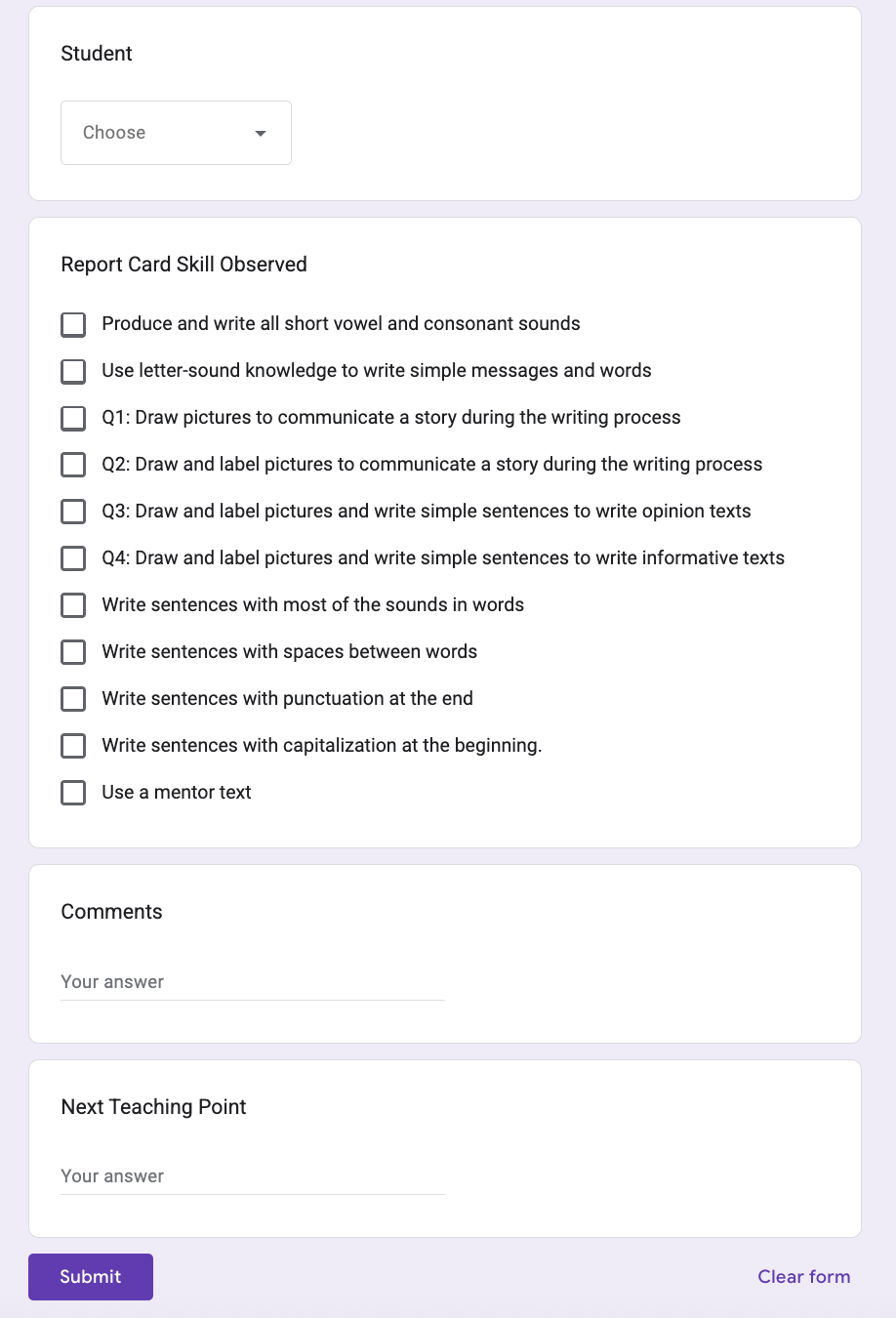 I keep two tabs open when I confer with a student: the actual form and the spreadsheet with notes. This allows me to check what a student and I chatted about last time and reminds me of my next teaching point. Using the search feature of the spreadsheet is much faster than flipping through my notebook to find the page about a certain student. Bonus: If you have coteachers in the room during writing workshop, other adults can use the form too. Consider adding a checkbox to record which teacher took the notes.