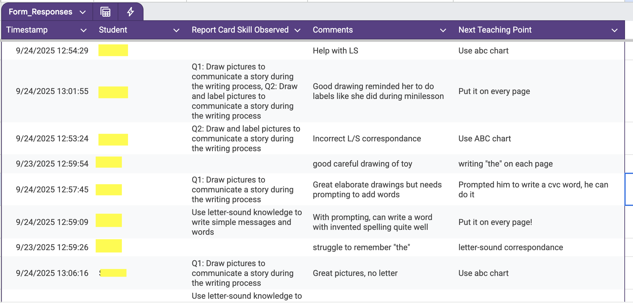 Click “View in Sheets” to see all your responses in a spreadsheet. I use the “Sort by” tool to guide instructional decision-making. When I sort by student name, all my notes about each writer are in one place. I can also sort by skill or by next teaching point to quickly identify patterns and form small groups.