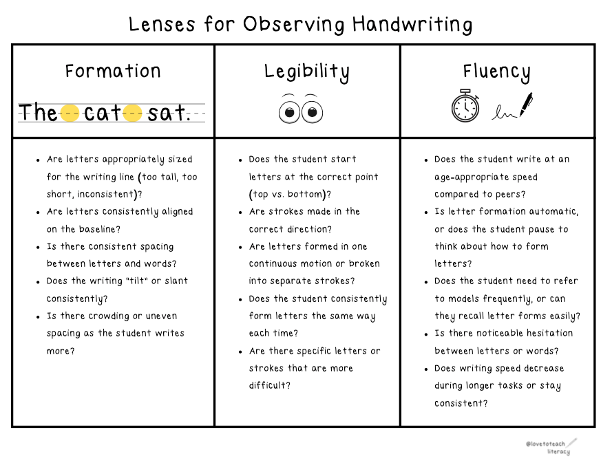 One way we study writing is by looking through the lenses of structure, development, and language conventions. We can apply the same approach to handwriting, examining it through the lenses of formation, legibility, and fluency. Studying our students’ writing through these lenses can help us identify areas of strength and next steps when it comes to handwriting.