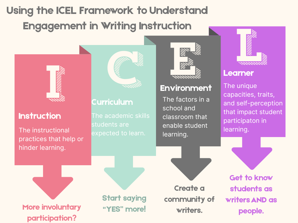 Since my part of the presentation is about the intersection of social-emotional learning and writing instruction, I organized my thoughts using the ICEL Framework (Wright, 2010). The ICEL Framework helps teachers analyze learning by looking at four areas teachers can actually influence: Instruction, Curriculum, Environment, and the Learner. Rather than focusing on student “problems,” it guides teachers to proactively examine the factors around the student that we can adjust to support success.