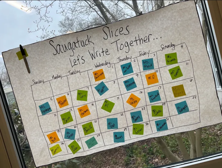 - Go BIG! Think about ways to invite more colleagues to write with you in March. This might include rallying your staff to participate in the challenge or thinking outside the box to find approaches that fit your school’s culture. At our school, we started by posting a giant March calendar and inviting people to sign up for just one day to write. We modified the challenge to see if, together, our community could write every day in March. (The answer was yes, and we’re heading into year four of this now-annual tradition!)