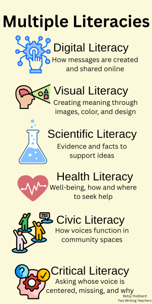 These expand beyond traditional reading and writing to include more environments where voices are engaged. Examples can include digital literacy, visual literacy, scientific literacy, health literacy, civic literacy, and critical literacy. There is overlap in many areas, and although some of the meanings behind these literacies might seem obvious, with a greater understanding of their importance, we can more intentionally embed them into our teaching.