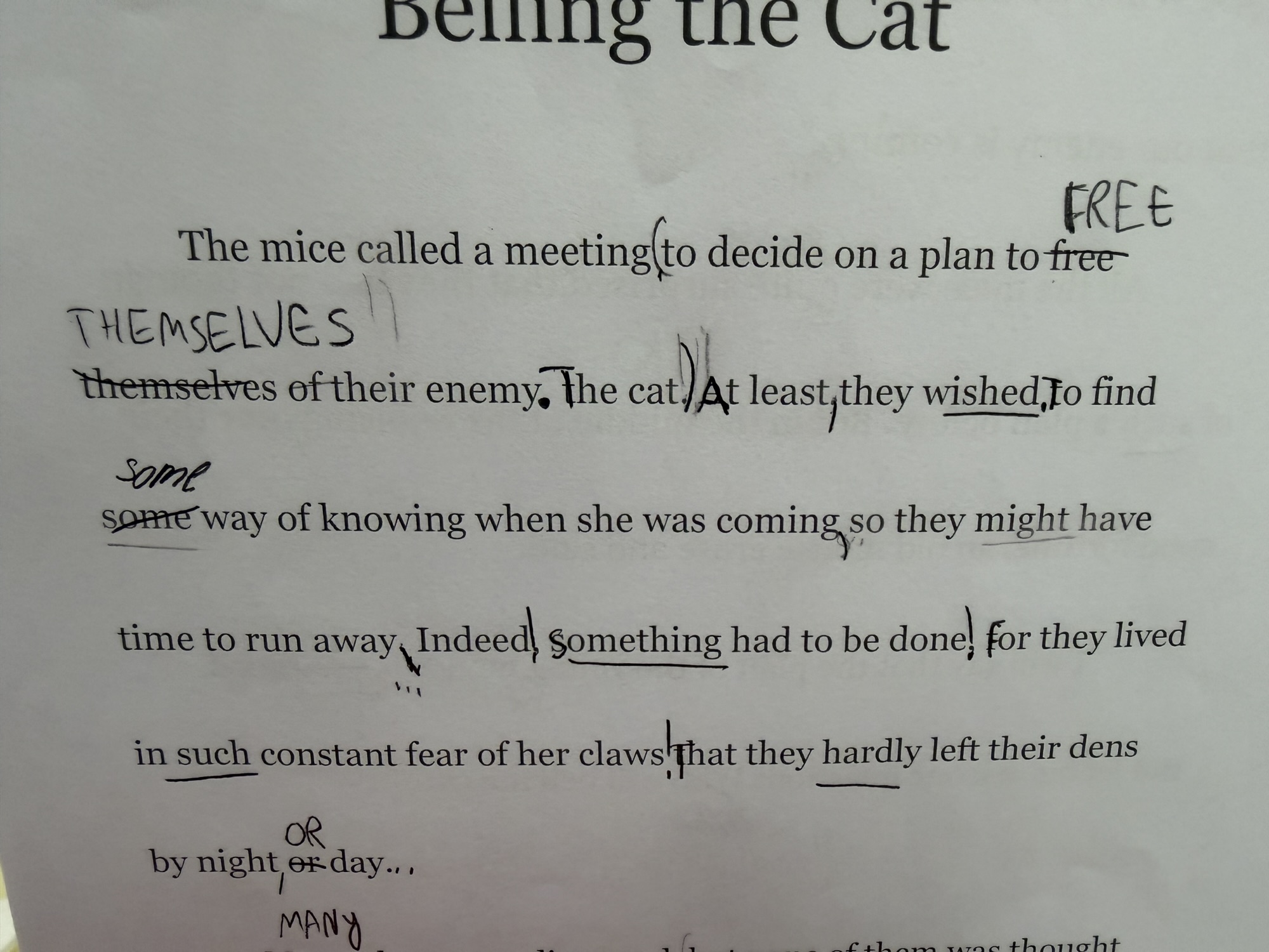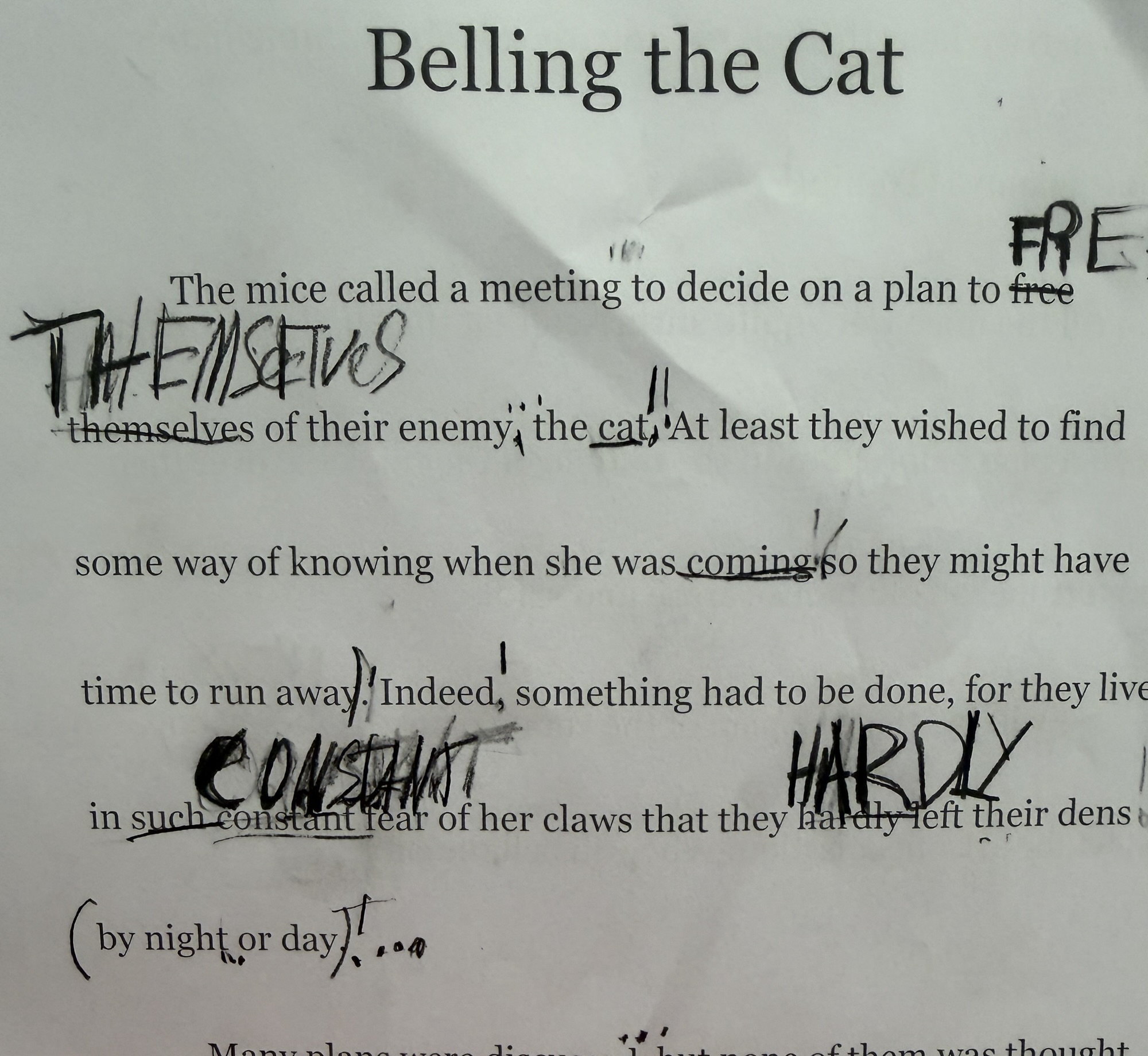 Getting Practice. Armed with these tools, we turned to Aesop’s fable “Belling the Cat.” I modeled playing with the read-aloud, showing how changes in my voice could be reflected visually in the text. Students then read the story out loud for themselves, changing punctuation or formatting as they saw fit – without a single change to the wording itself.