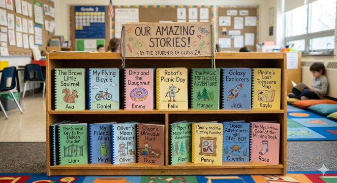 Student Book Displays are a good option when your students’ published pieces are in book form. Dedicate a shelf or window sill in your classroom where students can choose to read each other’s books during independent reading time. You could also ask your librarian for a space in the library to display your students’ books for the whole school to read.