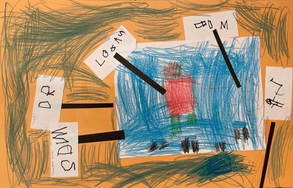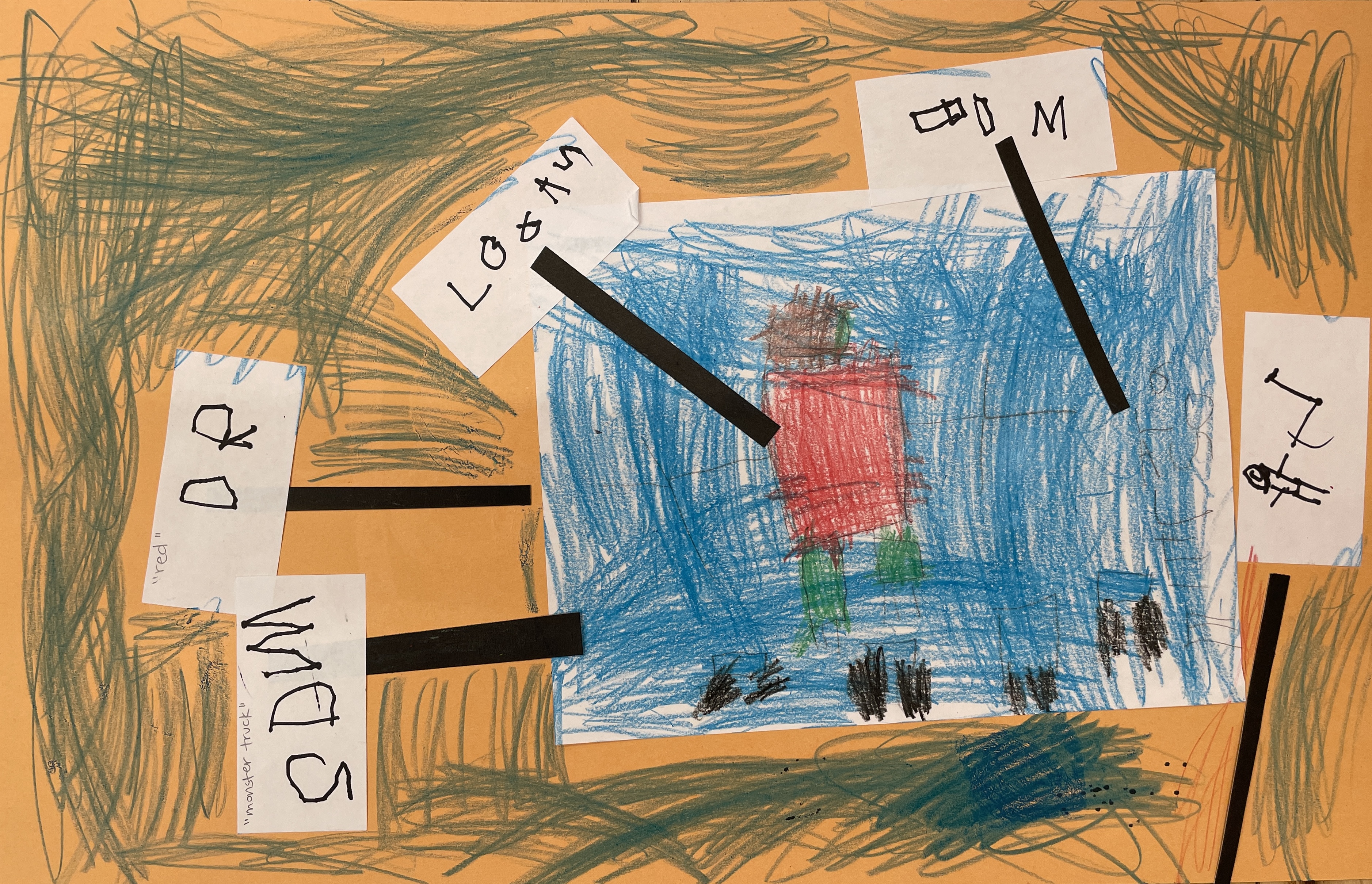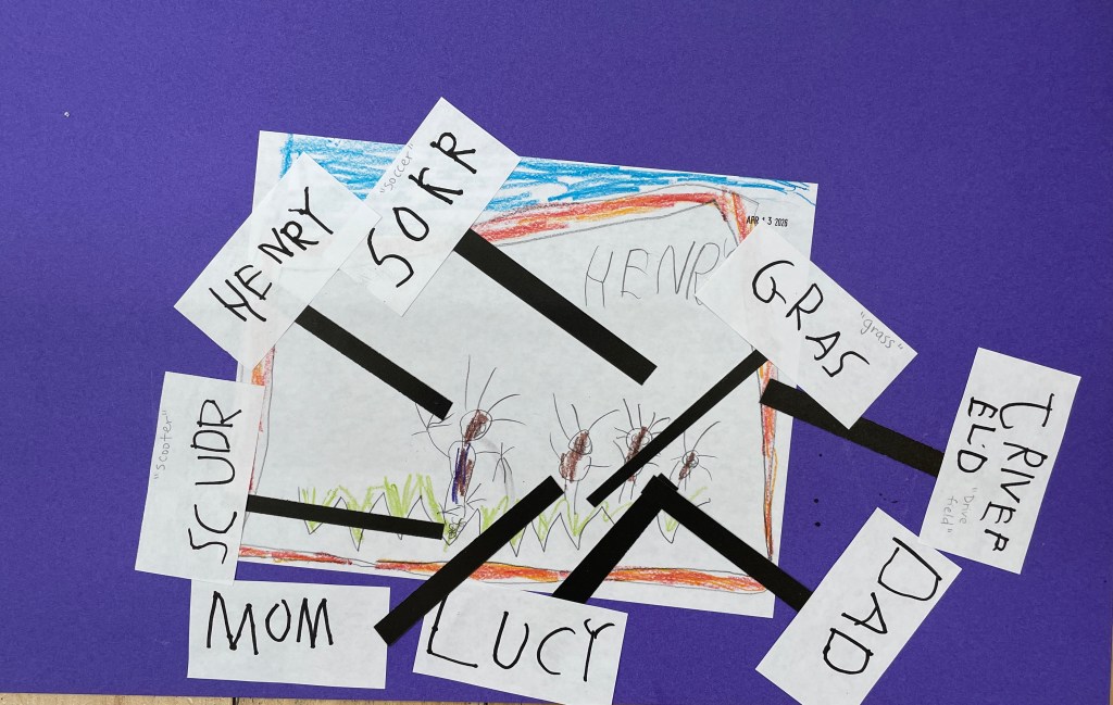After drawing it, I introduced labeling. I said, “I want to label the people, places, and things in my picture so that someone else looking at it will know what everything is.” Rather than having them write directly onto their drawing, as I typically do in kindergarten, I thought of creating something very concrete for children to use to physically connect their labels to the parts of the picture they describe. I cut skinny strips of black paper for the “connecting lines” and rectangular pieces of white paper for the labels. As the students decided on something they wanted to label in their drawing, they would sound out the word on the label paper and glue it, along with the connecting line, directly to the part of the drawing it described.