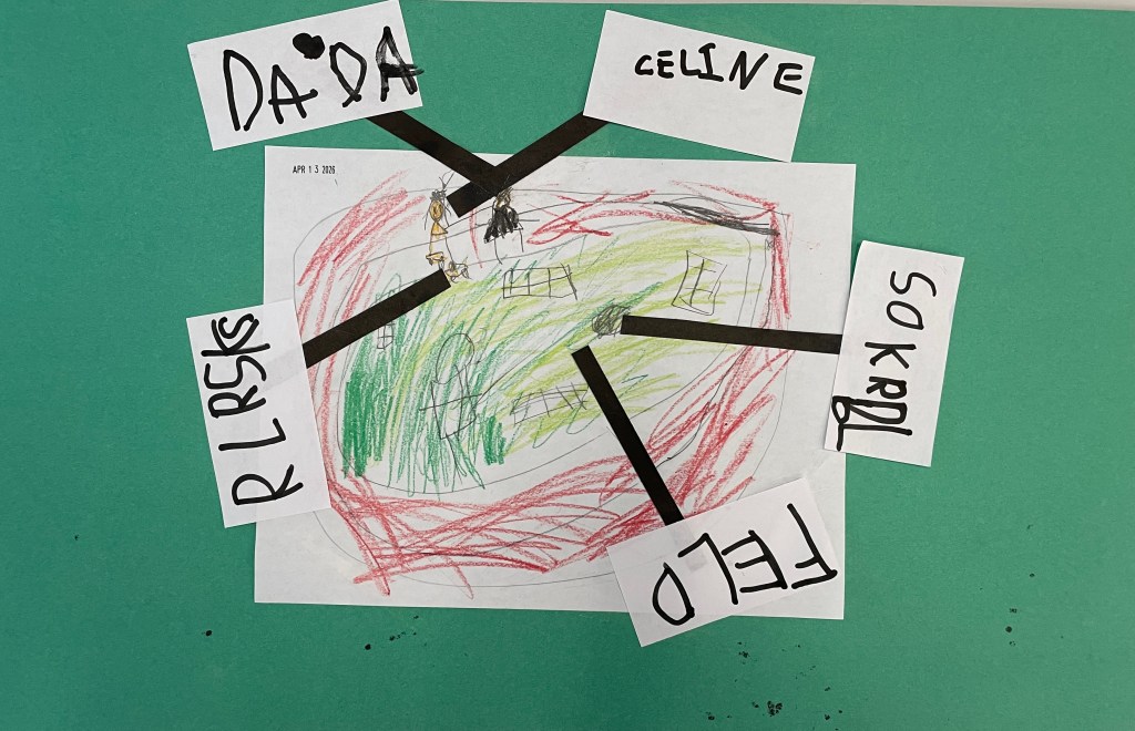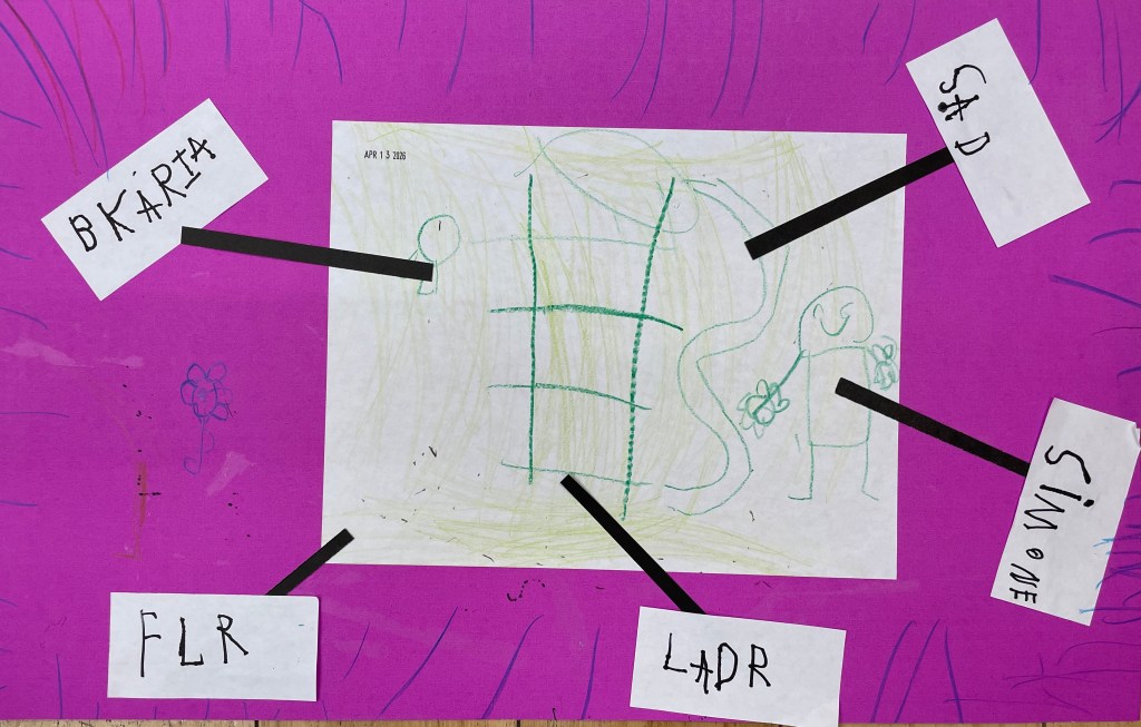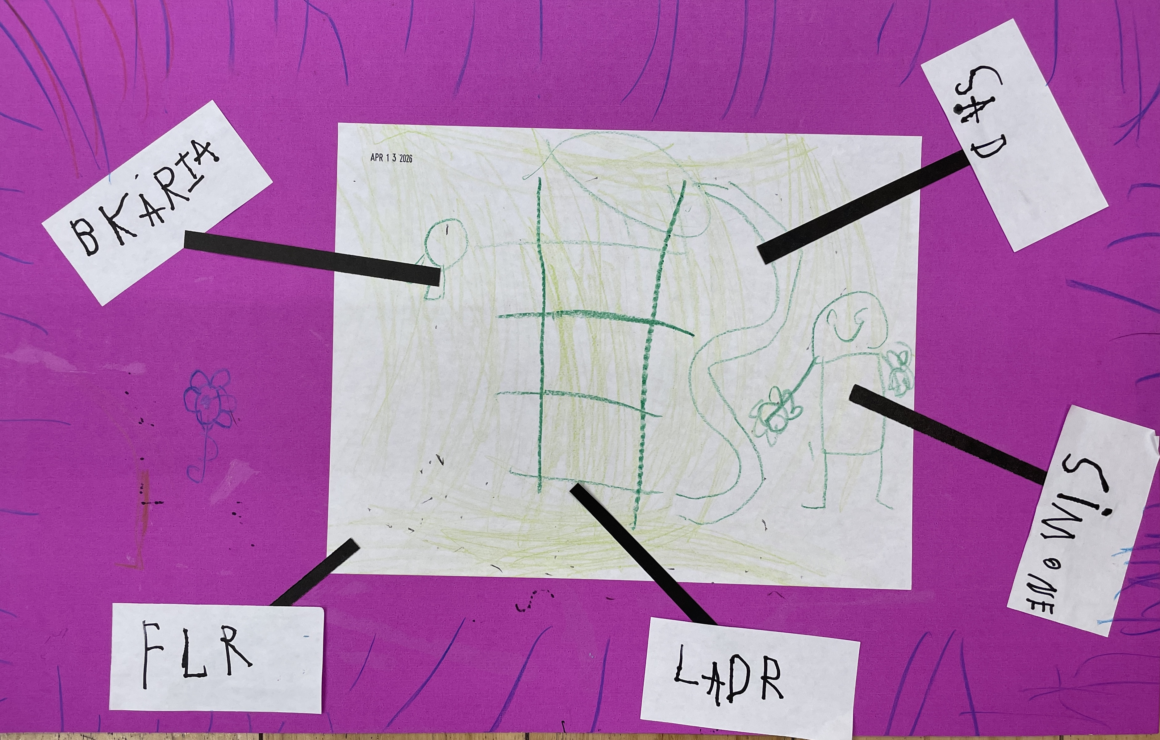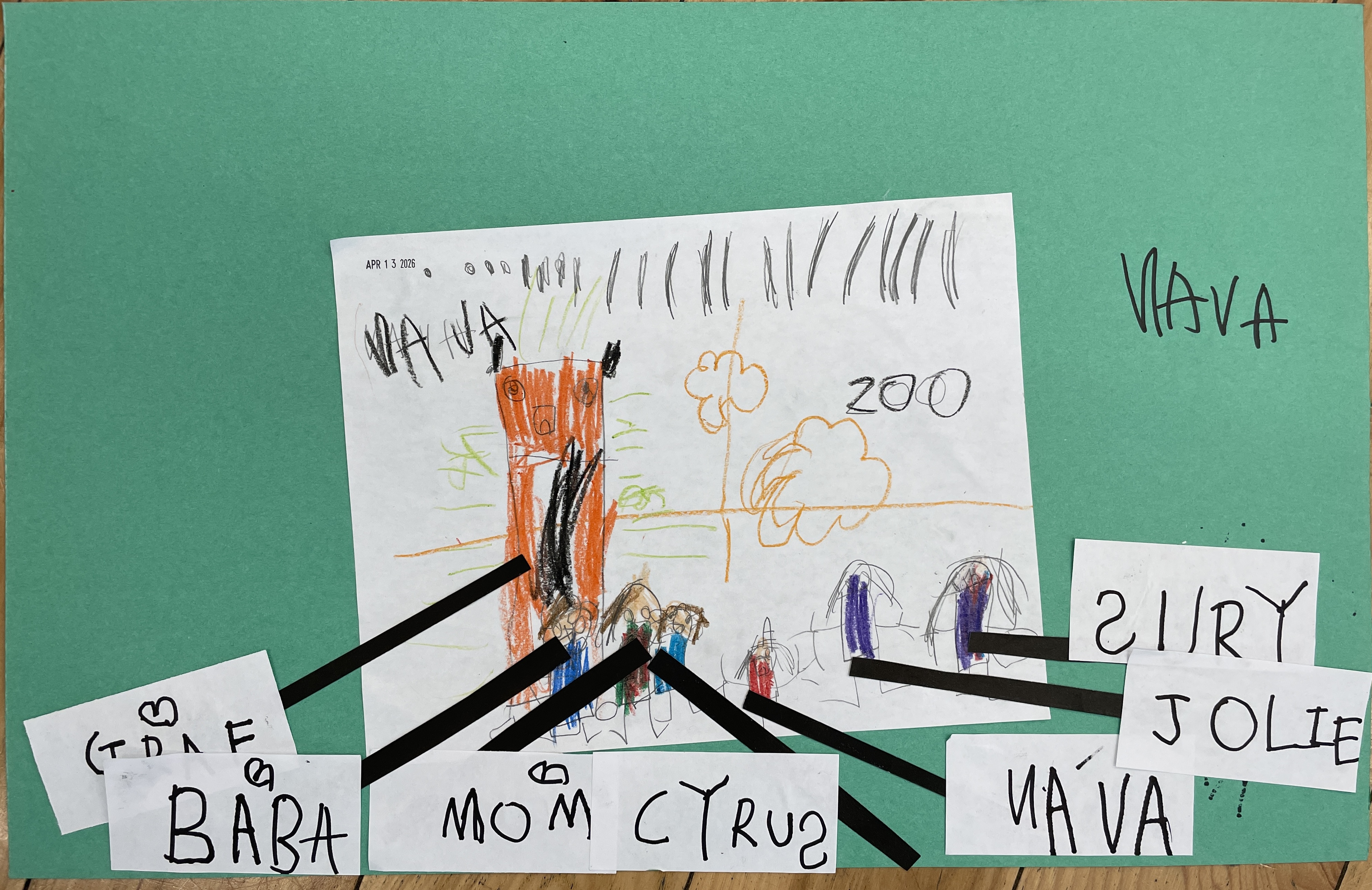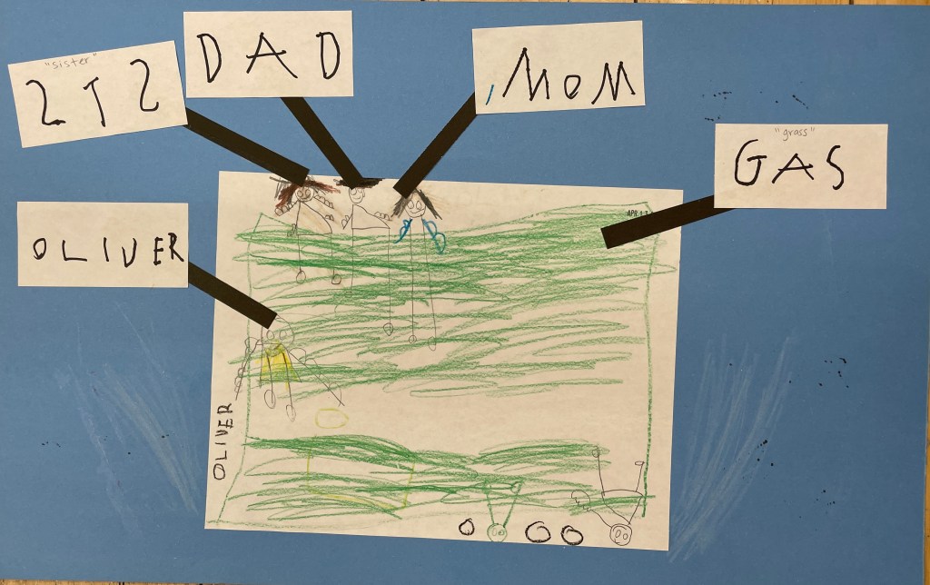 I wanted them to focus specifically on the people, places, and things (nouns) in their drawing to help them focus on the most important parts of their story. Many children labeled themselves and other people, typically family members (mom, dad, grandma, sister). Some children labeled the places where they actually were (soccer field, zoo, Greece), and most labeled the things they drew (skooter, ice cream, slide, roller skates). I hoped that children would use their emerging letter-sound correspondence to capture the first sound of each word they were trying to write. I was pleasantly surprised to see that most students attempted middle and ending sounds too!