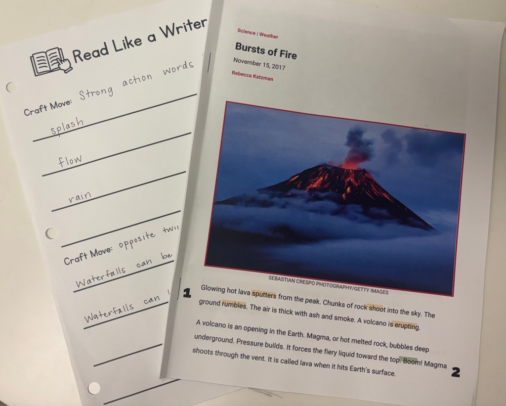 For our introductory lesson, we selected a Time for Kids article on volcanoes. Students are currently reading and writing extensively about earth systems and weather, but our reasons for choosing this piece went far beyond the topic. As we reviewed the second-grade writing standards and the expectations for writing in this unit, the article showcased several high-leverage writing moves for kids: