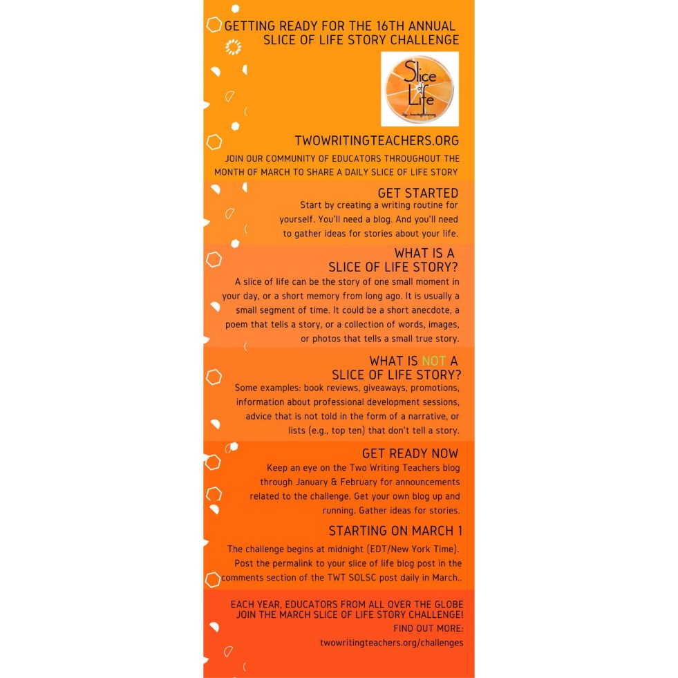 We will host the 16th Annual Slice of Life Story Challenge here at Two Writing Teachers this March. Since 2008, the challenge's mission has remained the same: to support teachers who want to write daily. We believe that teachers who write regularly can better support the students they teach in writing workshops daily.