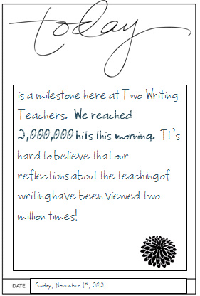Today is our FIFTH blogiversary. That's right! Five years ago today we started Two Writing Teachers. Here's a little look at five things that have changed between June 12th, 2007 and June 12th, 2012. Five years ago Ruth and I had met in person just once. Now we have seen each other in person quite… Continue reading Today’s Our Blogiversary