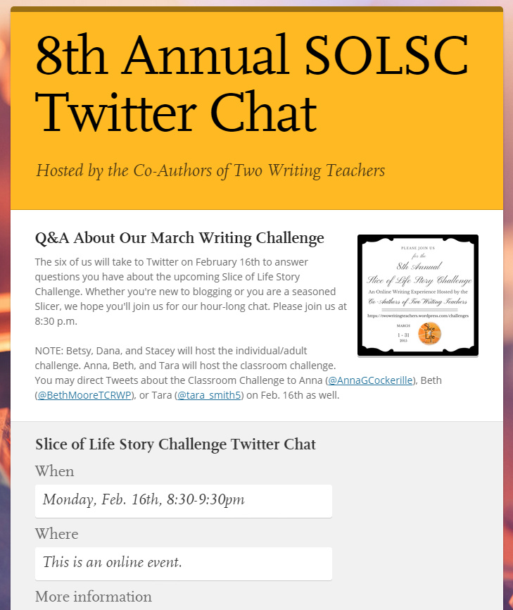 We would like TWT to stay true to its mission as a place where educators who are passionate about writing can gather inspiration and share ideas. We value your participation and encourage you to comment on all our posts, and especially to comment on each other’s Slice of Life Stories. Please refer to these guidelines when commenting.
