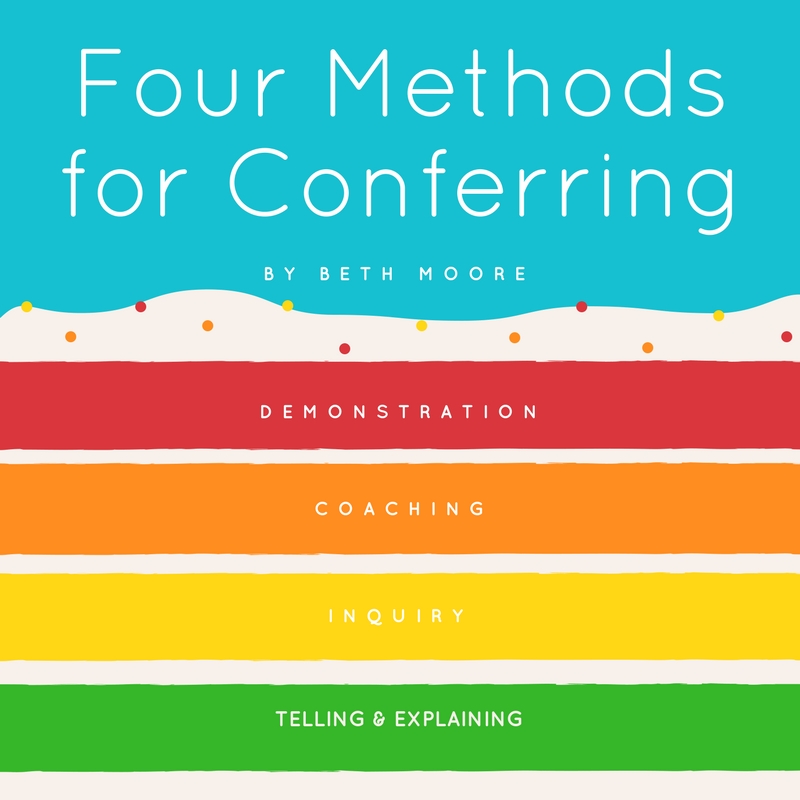 When I was a new teacher, I learned from Lucy Calkins that there are basically four overall methods to choose from when planning instruction: 1) demonstration, 2) coaching, 3) inquiry, and 4) telling/explaining. This four-method framework is useful for thinking about conferring.