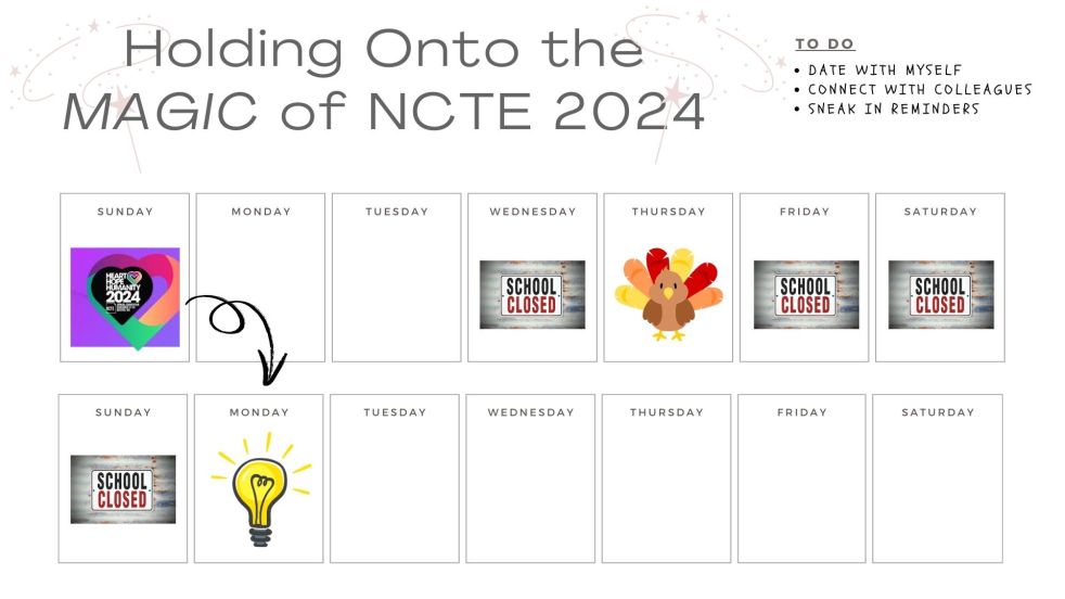 Knowing that the ideas I’ve gathered and the knowledge I’ve gained at NCTE are so important and impactful, I’ve begun shifting my focus during the week between the conference and Thanksgiving to how I’m going to sustain my learning once the dust from the holiday weekend settles.
