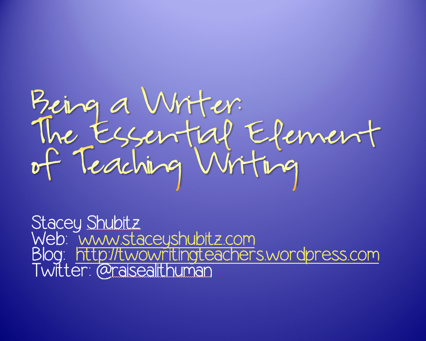 My keynote begins with a story about over-packing a diaper bag as a new mom and then pairing down the bag to the essentials once my daughter got older. From there, I talk about how I discovered that to be an effective teacher of writing, I had to be a Writer. My speech covers why I write, how to make time for a writing life, conquering the fear of writing, the Slice of Life Story Challenge, how to model writing from the heart, and the importance of putting writing at the center of everything we do in our classrooms.