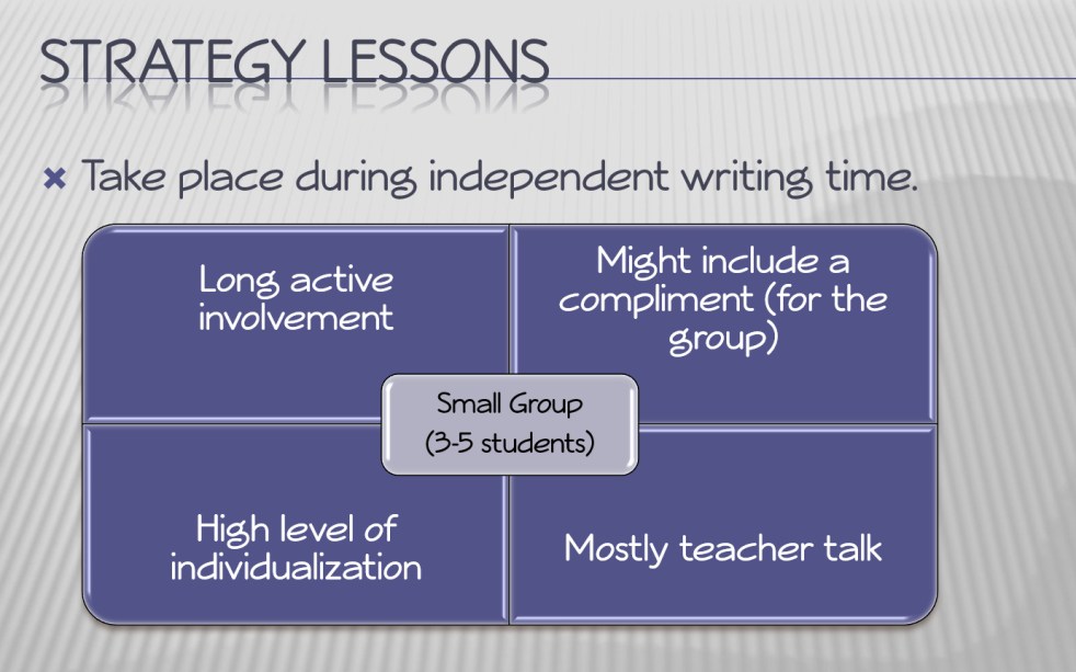 Strategy lessons allow you to meet with a small group of writers during independent writing time. They're essentially small-group minilessons based on needs you notice several writers exhibiting.