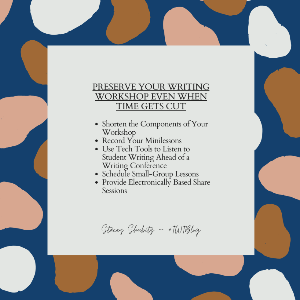 Time is a precious commodity in elementary schools. Making the time for a daily writing workshop often means that something else has to get short shrift. However, sometimes, the time for writing workshop gets cut by five or ten minutes. Here are several suggestions for what you can do if writing time gets cut.